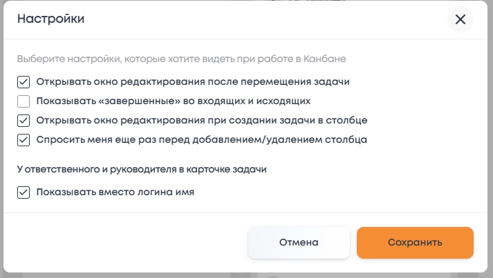 Если опция включена, то в поле «Ответственный» и в поле «Руководитель» карточки будет отображаться полное имя пользователя, вместо его логина.