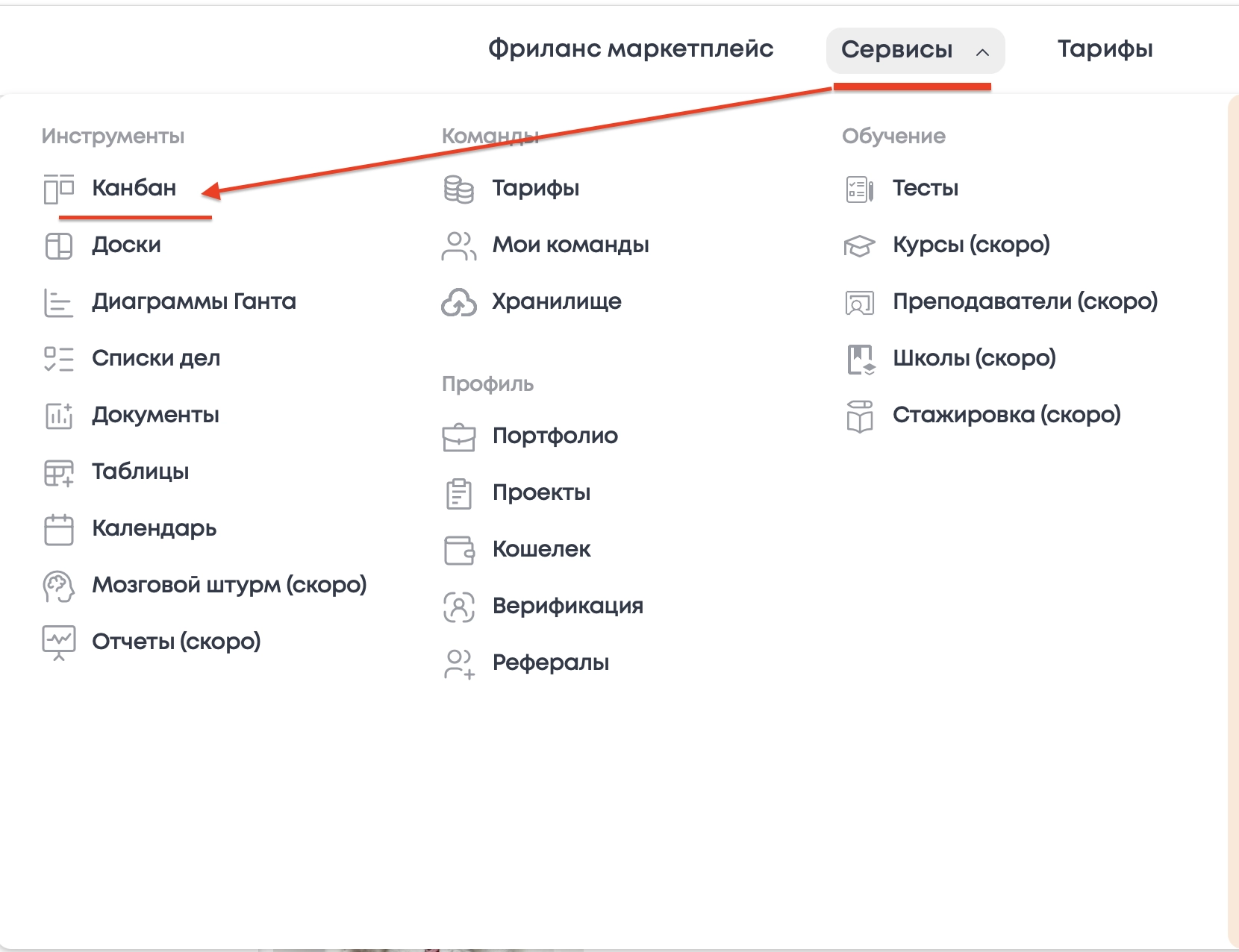 2. В горизонтальном меню открыть раздел "Сервисы", а затем нажать на заголовок Канбан.
