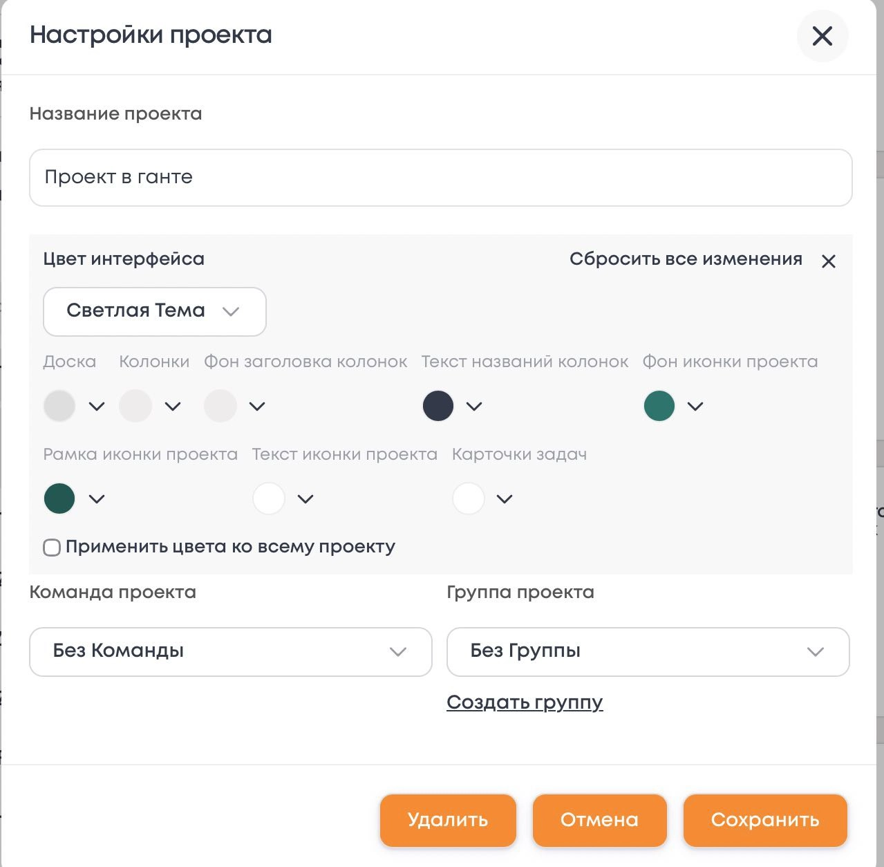 Важно: Выбранная тема применяется глобально ко всему интерфейсу Канбана для этого проекта.