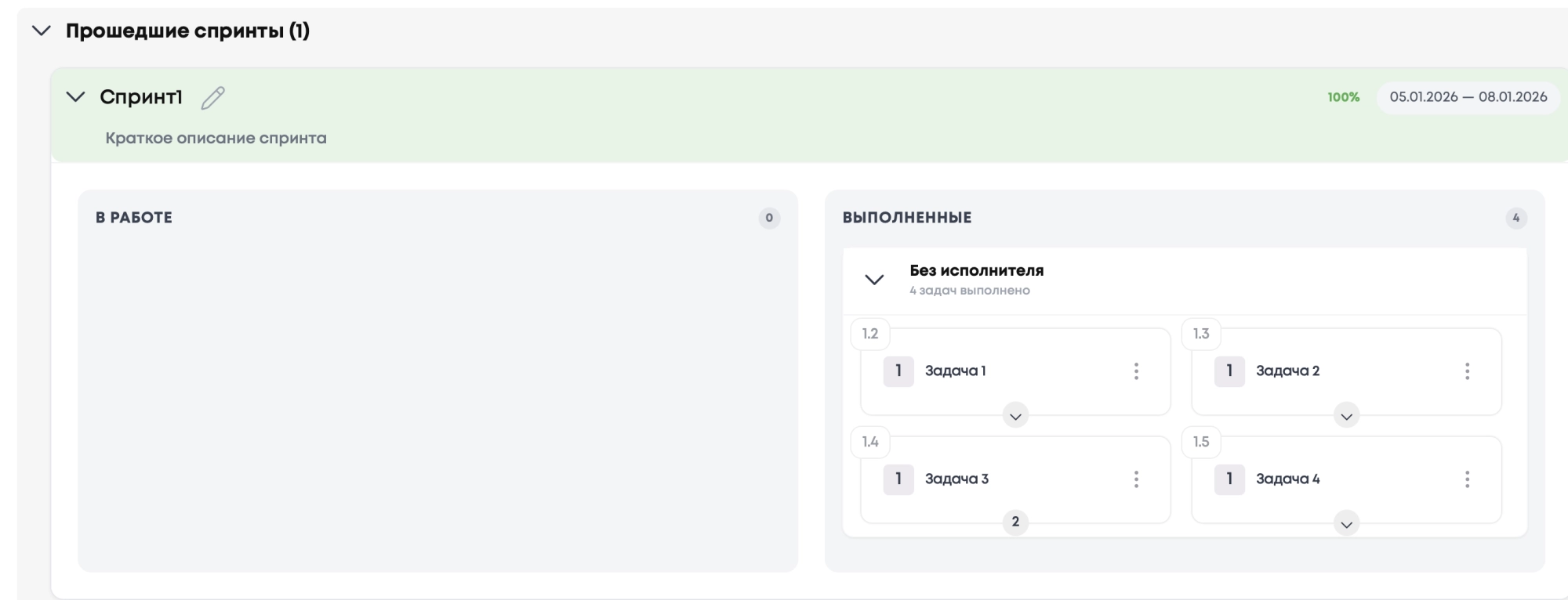 После окончания даты спринта спринт автоматически перемещается в раздел «Прошедшие спринты».